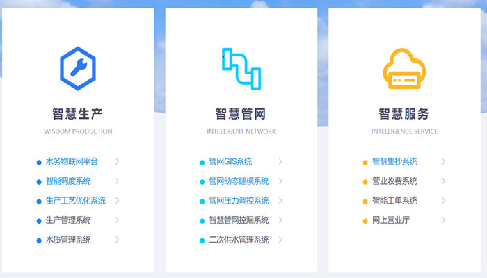 智能投药系统、配水优化调度系统、管网地理信息系统、管网压力调控系统、水力动态建模系统、管网漏损管理系统、二次供水管理系统、智能客服系统